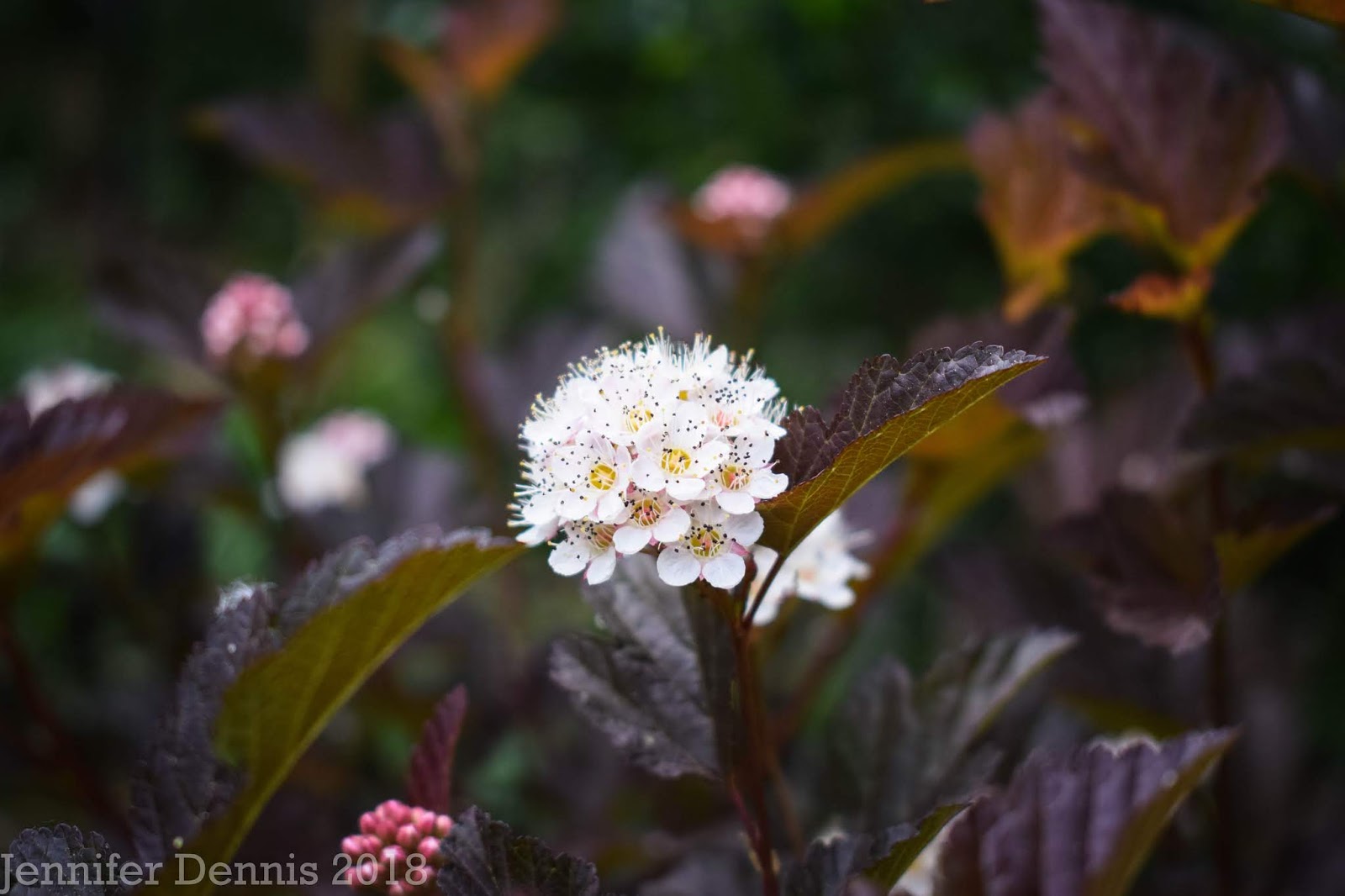 Sometimes the blooms of hedges steal the show momentarily. I use physocarpus in my gardens for a pop of burgundy/bronze foliage color, but their blooms are pretty nice too!